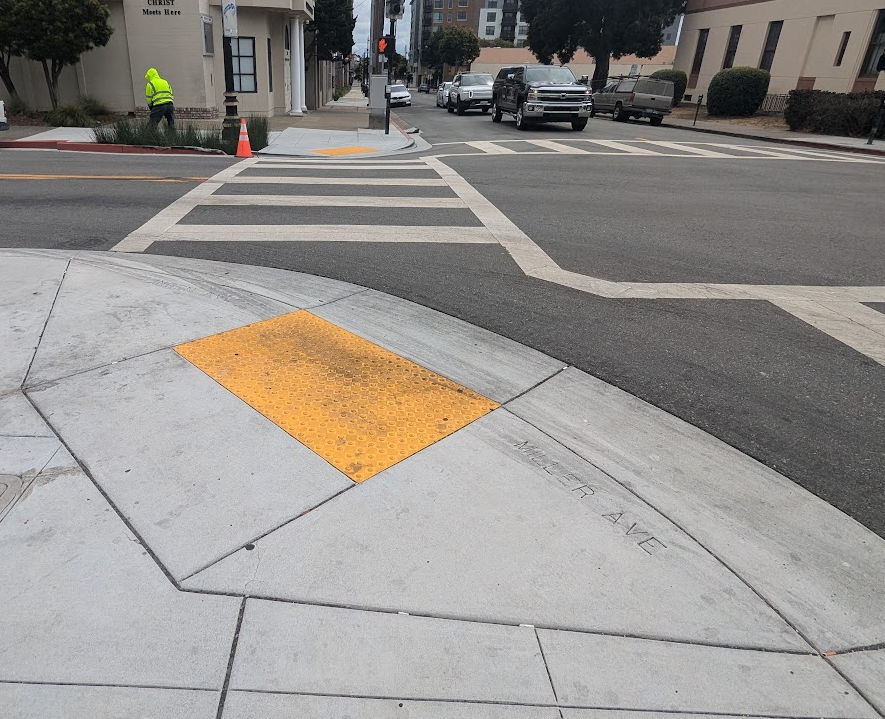 A newly installed curb ramp, marked by a vibrant yellow panel and distinctive nubby texture, eases the transition from sidewalk to street for pedestrians. Their yellow color and bumpy texture act as visual and tactile signals for pedestrians, and particularly aid those with limited vision or mobility.