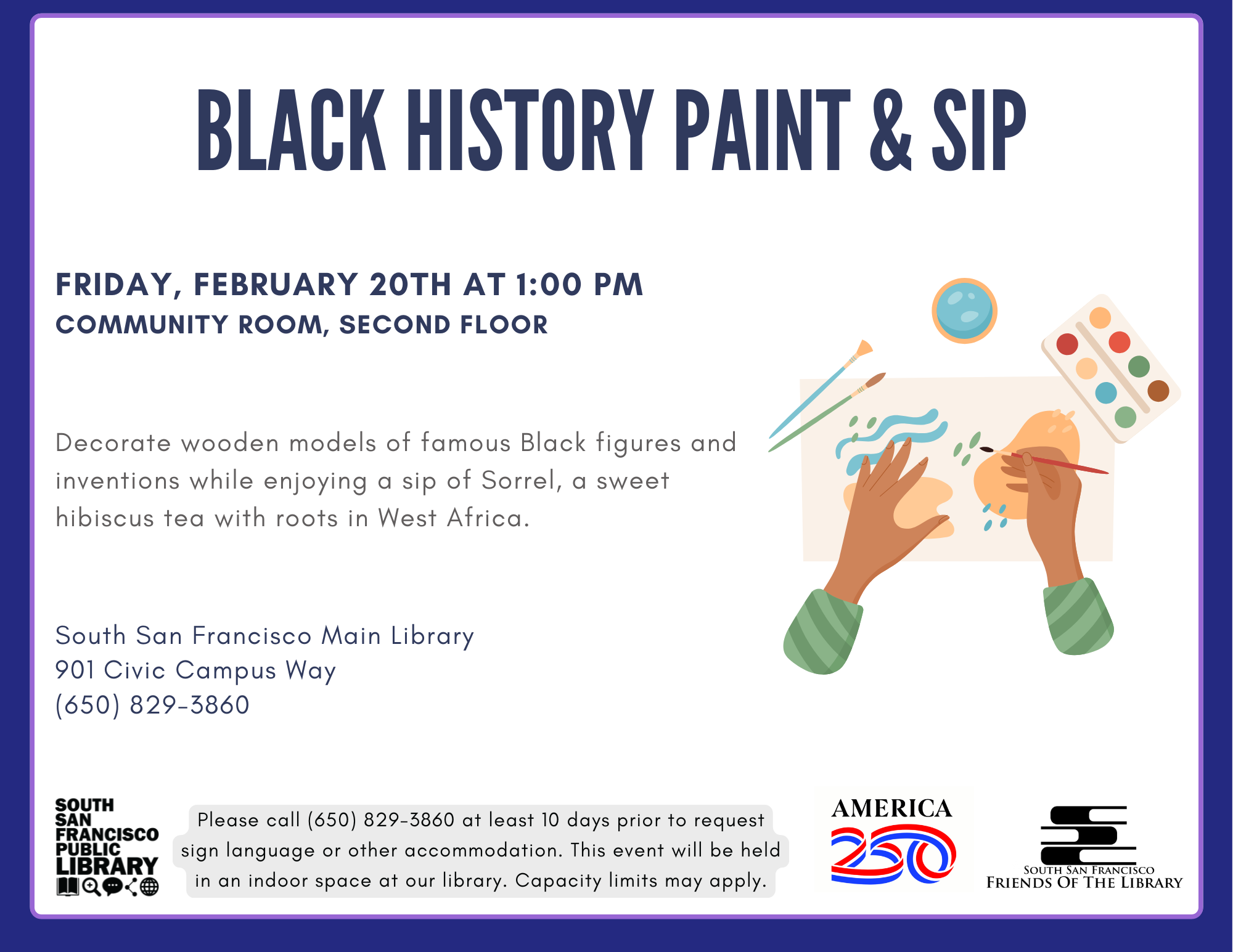 Decorate wooden models of famous Black figures and inventions while enjoying a sip of Sorrel, a sweet hibiscus tea with roots in West Africa.
