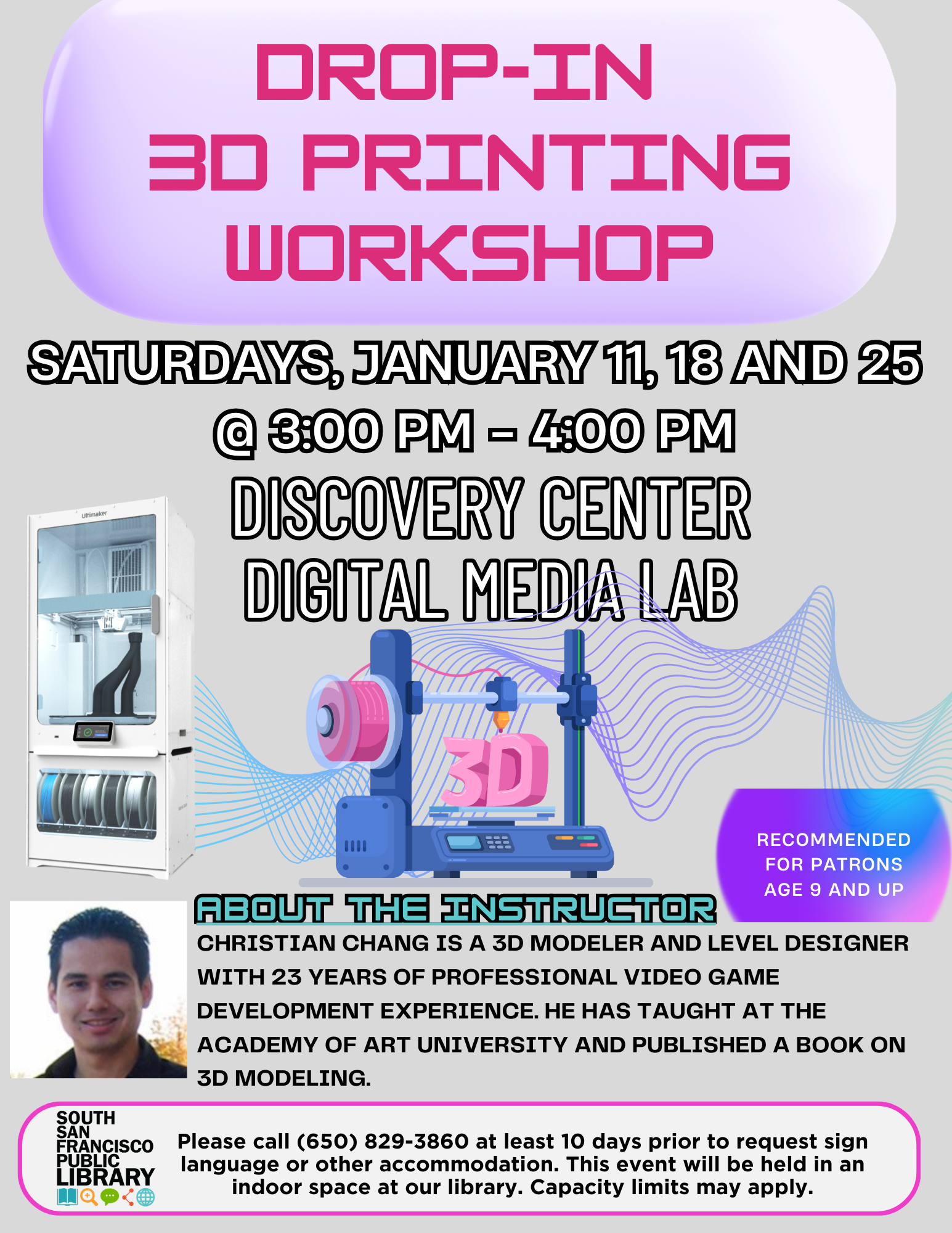 This workshop is for people who are currently signed up for or have all ready taken a 3D printing class. In this workshop you can get help on your own custom 3D designs and/or extra help with Tinkercad.