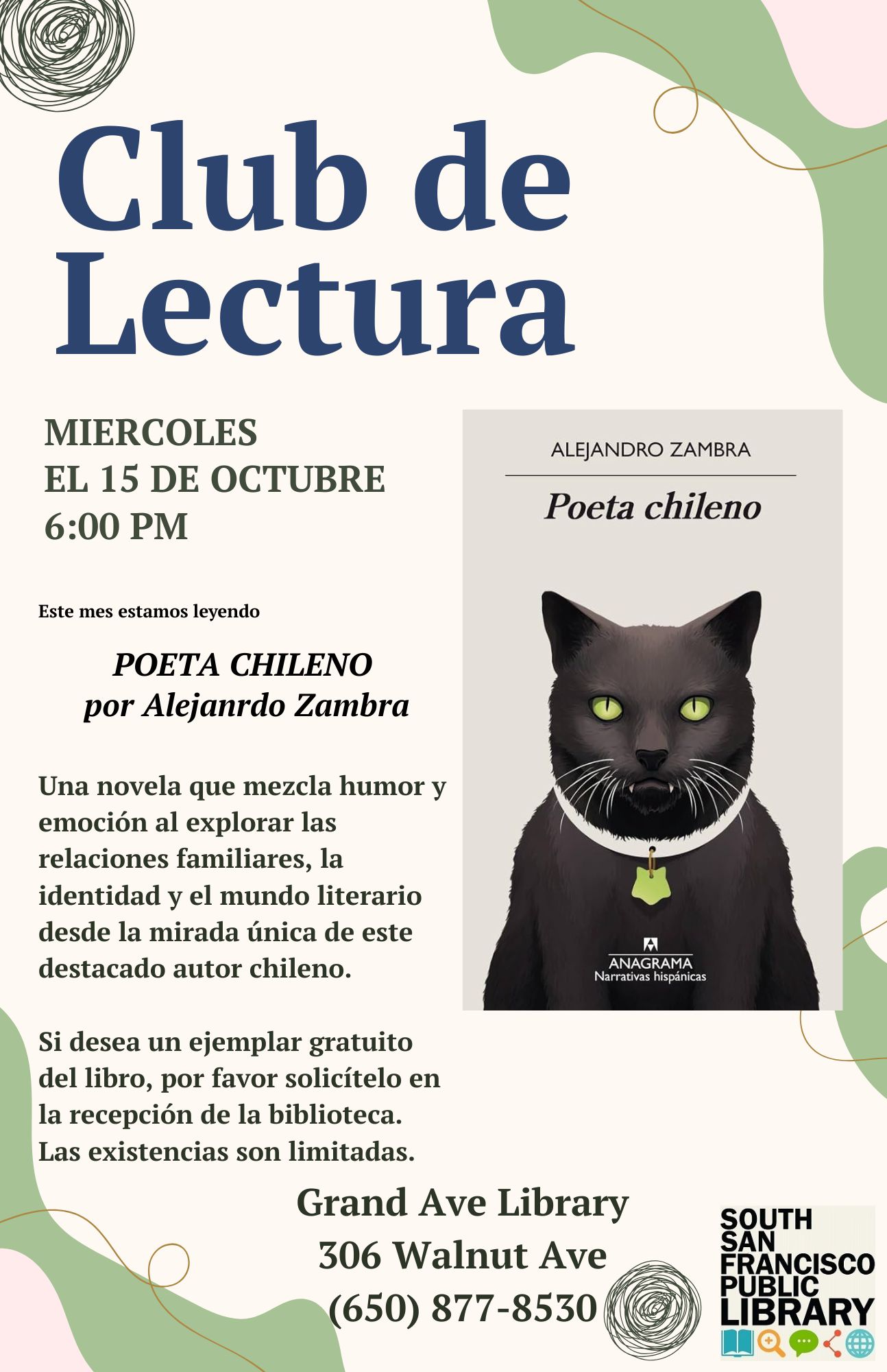Le invitamos al club de lectura de la Biblioteca Grand Avenue para comentar Poeta chileno de Alejandro Zambra, una novela que mezcla humor y emoción al explorar las relaciones familiares, la identidad y el mundo literario desde la mirada única de este destacado autor chileno.