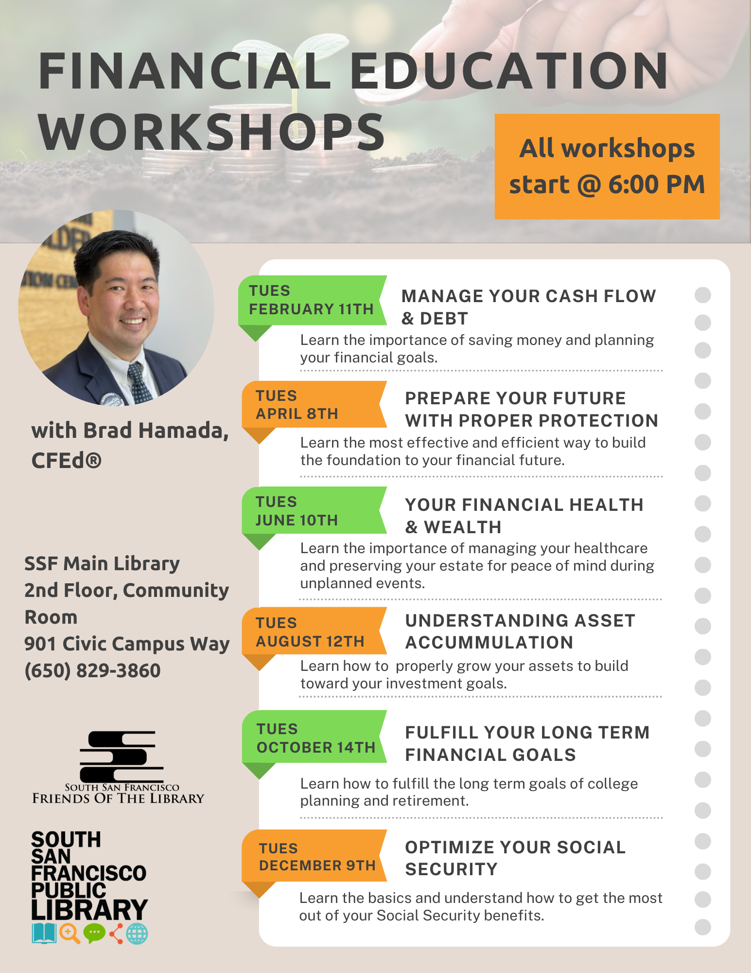 | In this workshop we discuss how to properly build towards your investment goals. It is important to have a plan on how you save your money, and also understand what strategies can help you optimize your money over the long term. You will solidify your knowledge on how to apply money concepts to your life so you can accumulate assets and build wealth with utmost confidence. |