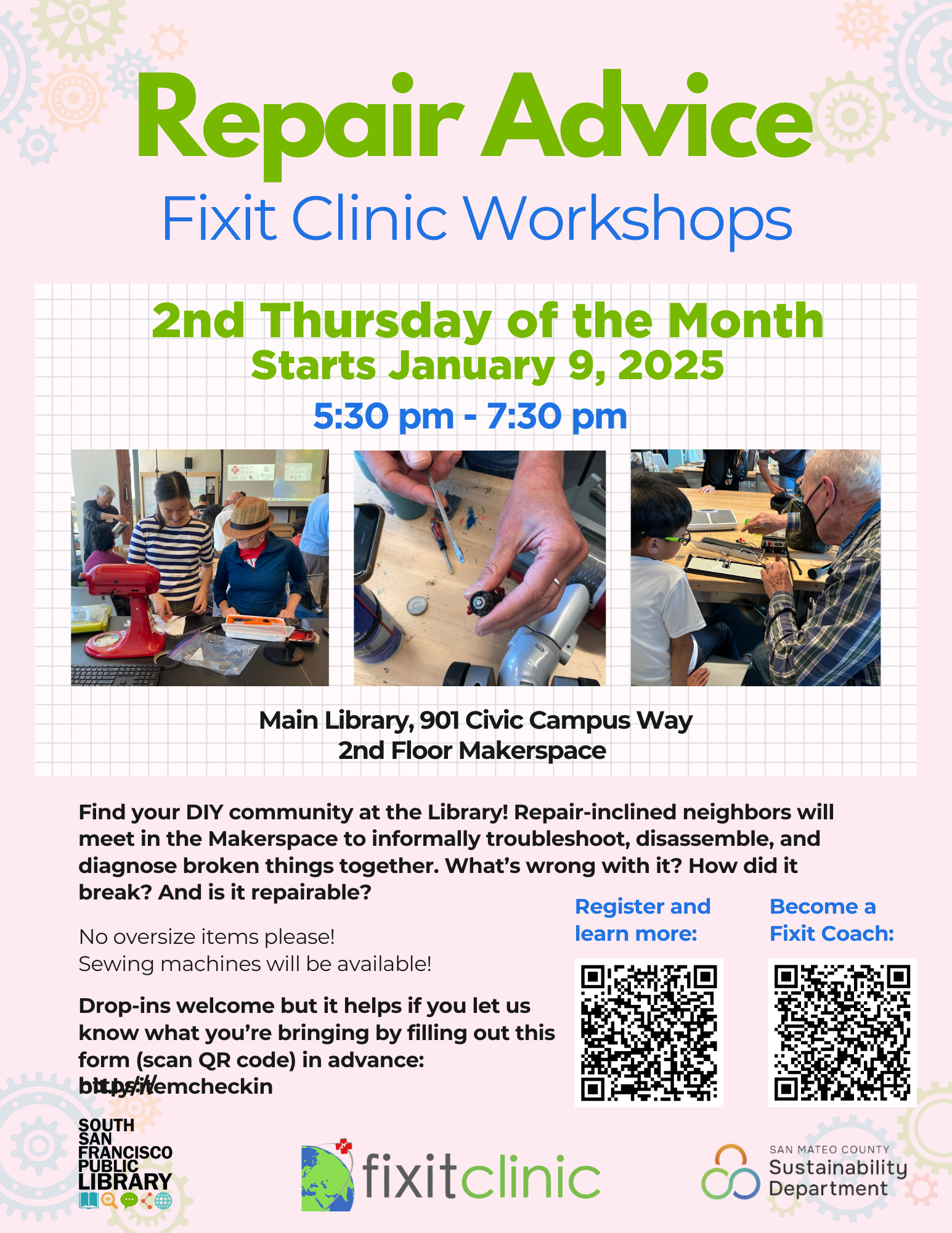 Repair-inclined neighbors will meet in the Makerspace to informally troubleshoot, disassemble, and diagnose broken things together.