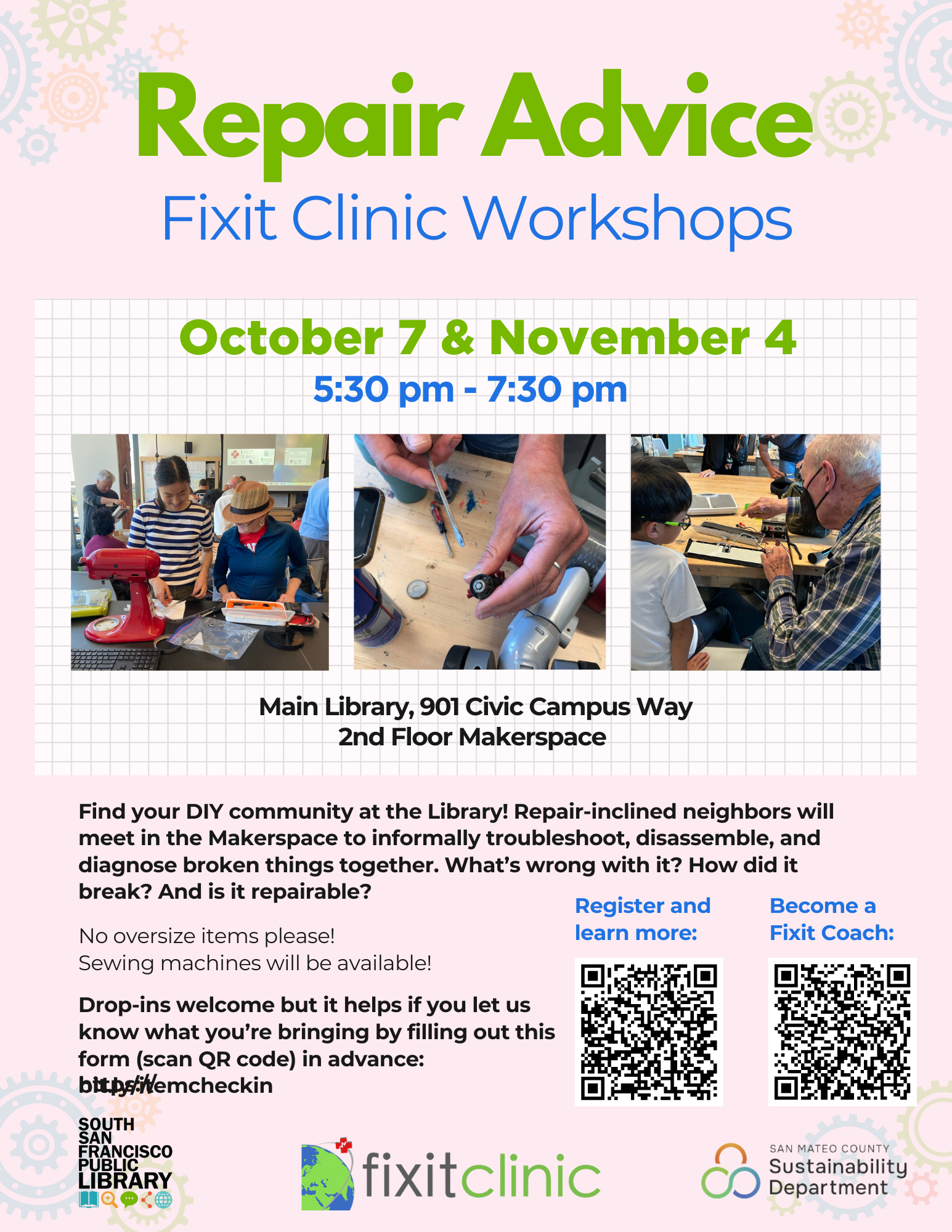 Find your DIY community at the Library! Repair-inclined neighbors will meet in the Makerspace to informally troubleshoot, disassemble, and diagnose broken things together.