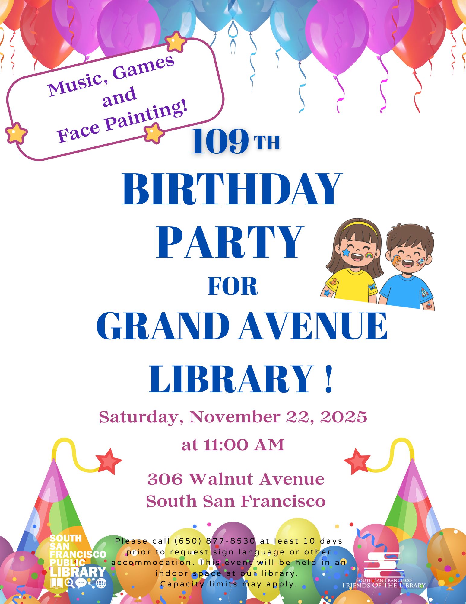 Celebrate Grand Avenue Library's 109th Birthday! Join us for a read aloud, songs, dancing, games AND FACE PAINTING!