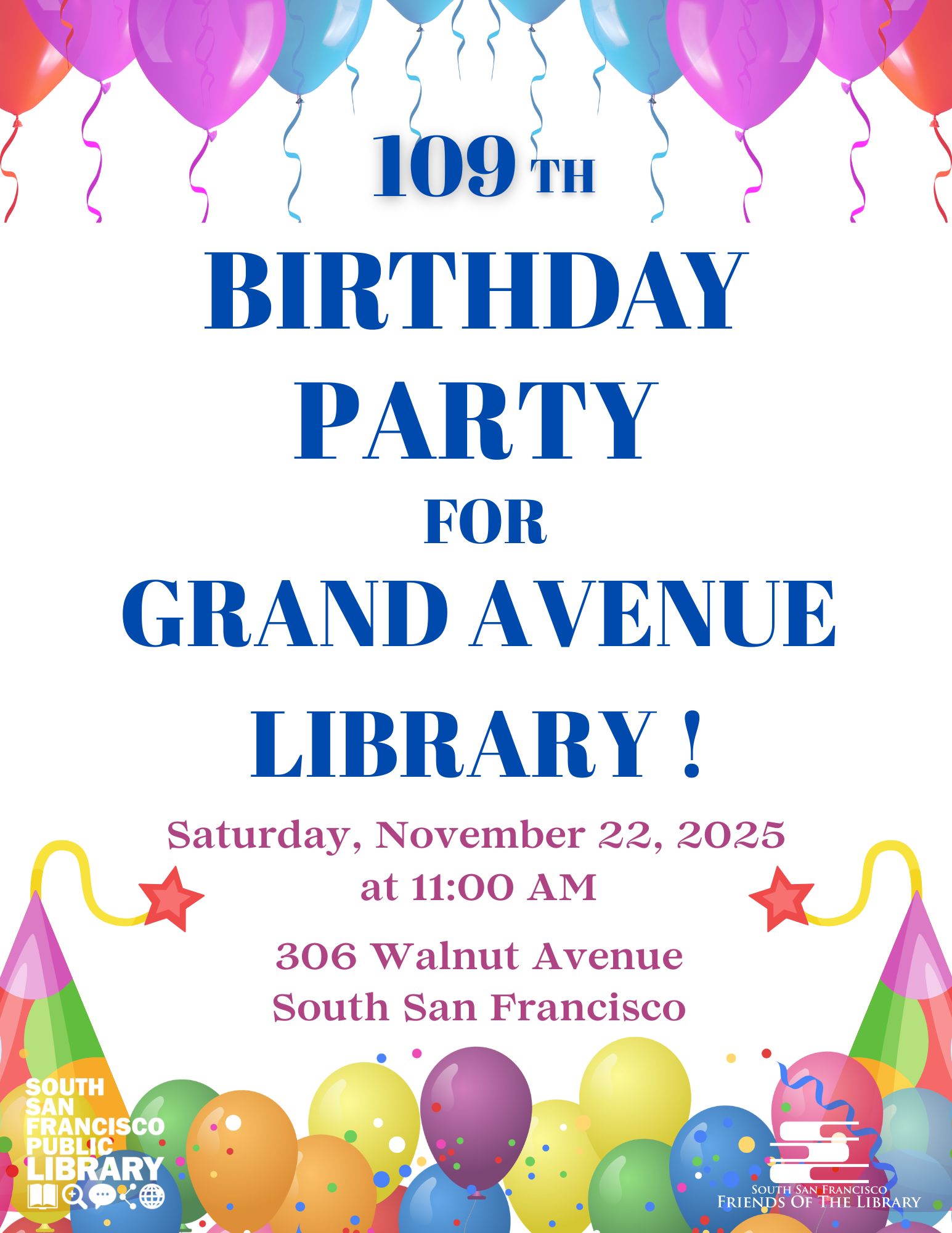 Celebrate Grand Avenue Library's 109th Birthday! Join us for a read aloud, songs, dancing, and games!