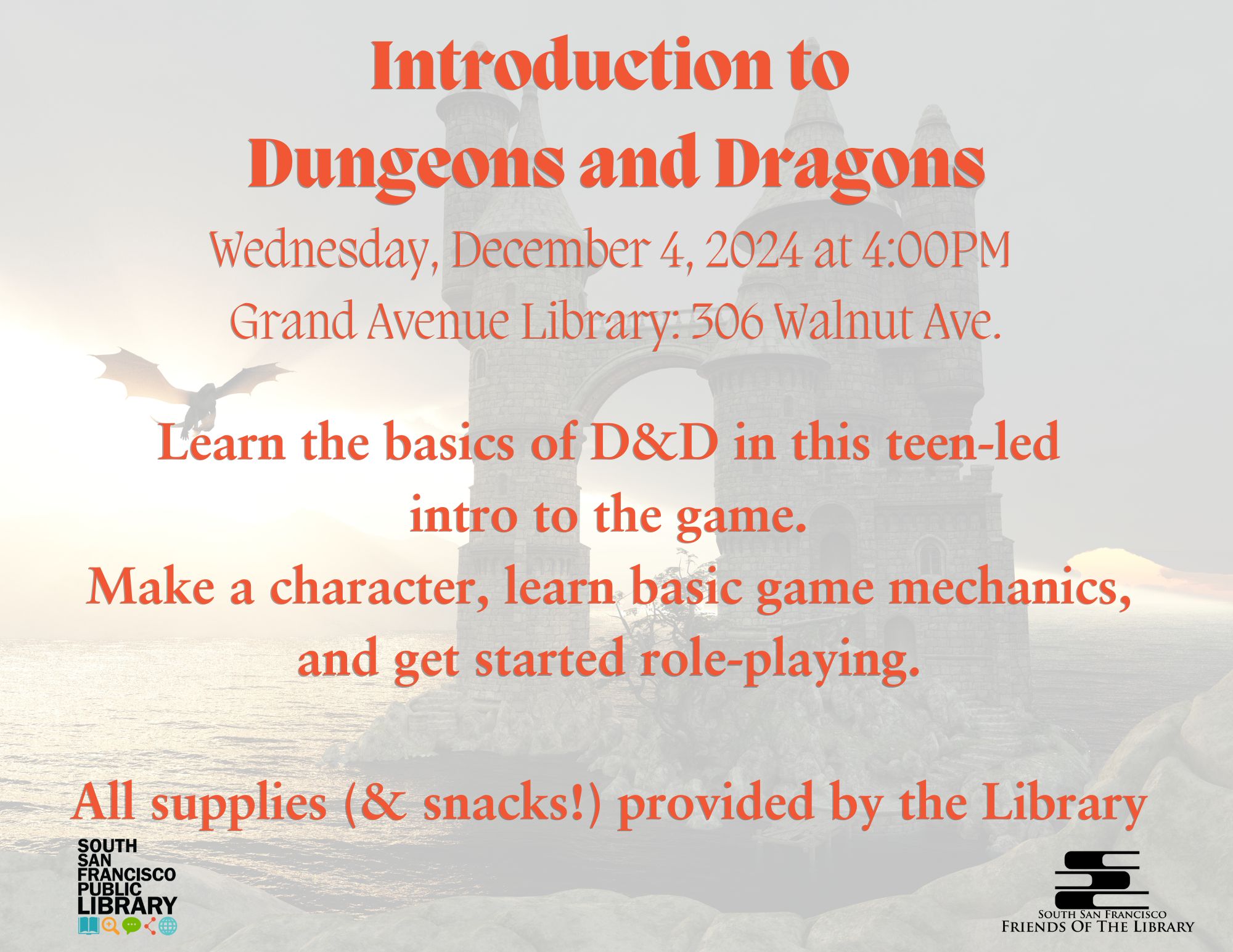 Learn the basics of D&D in this teen-led introduction to the game. Create a character, learn the basic game mechanics, and get started role-playing. All supplies (& snacks!) provided.