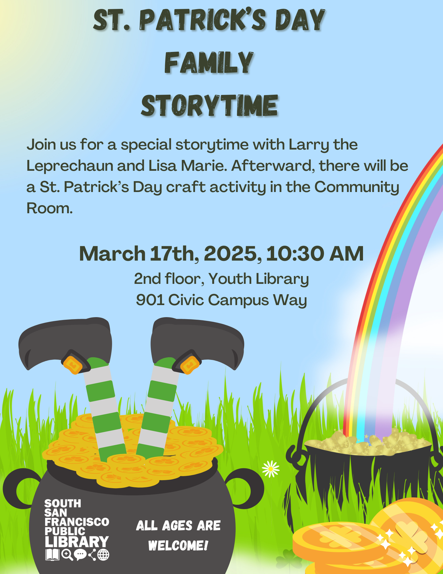 Join us for a special St. Patrick's Day family storytime with Larry the Leprechaun and Lisa Marie. Afterward, there will be a St. Patrick's Day coloring and craft activity in the Community Room.