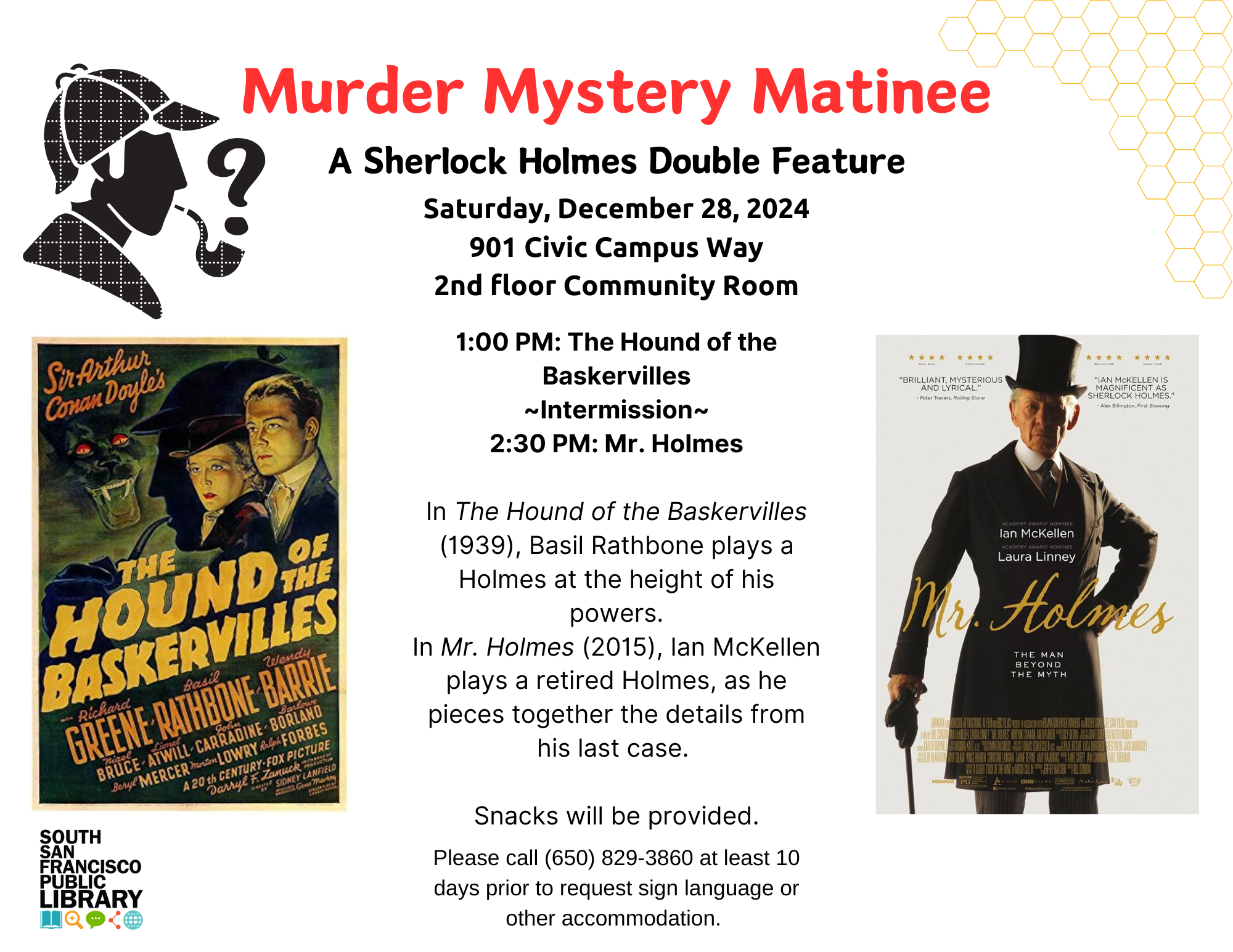 Snacks will be provided, while supplies last. Doors open at 12:45 PM; The Hound of the Baskervilles will start at 1 PM, followed by Mr. Holmes at 2:30 PM.