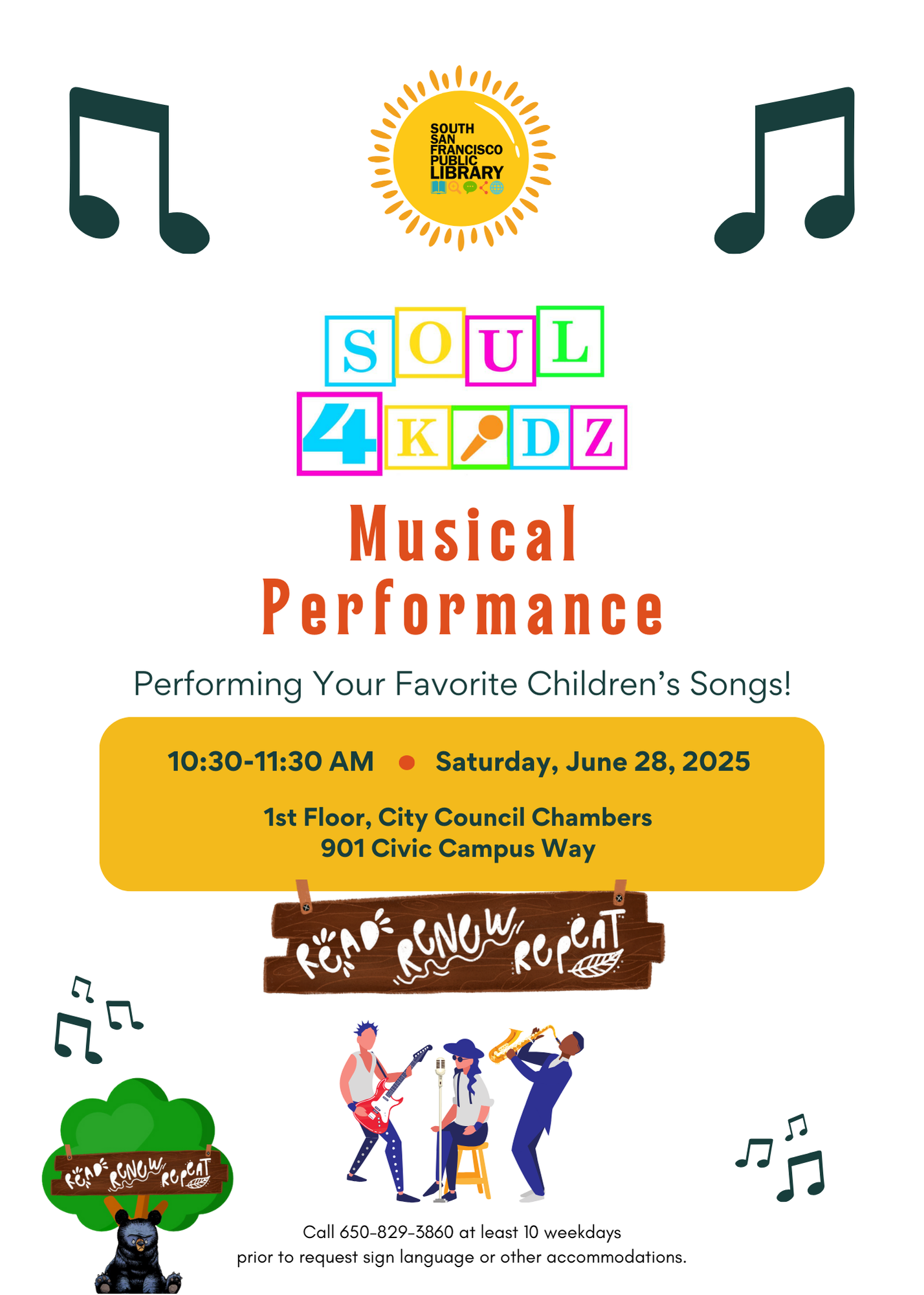 Soul 4kidz is a band that plays your favorite children's songs with a soulful twist. Join them in the Youth Library for a morning of song, dance, and fun!