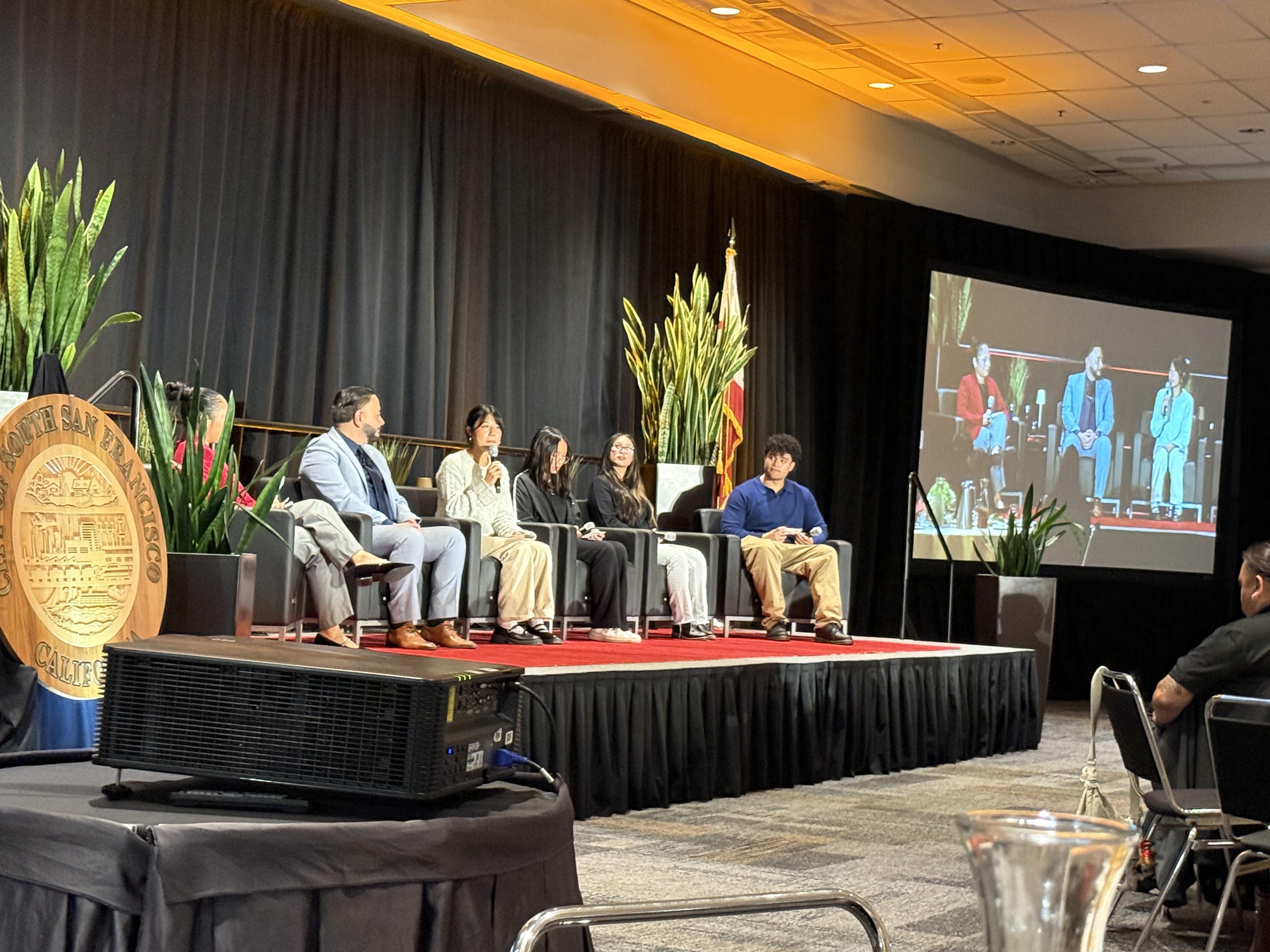 Mayor Eddie and students on stage, sitting on leather seats having a fireside style chat
