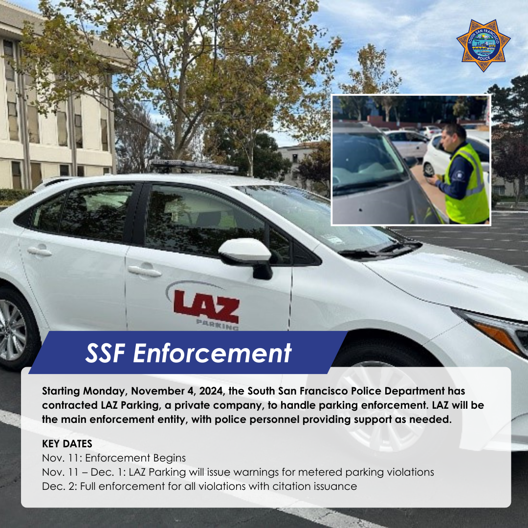 The South San Francisco Police Department is working in collaboration with LAZ Parking, a professional parking service provider, to enhance parking enforcement services throughout the city.